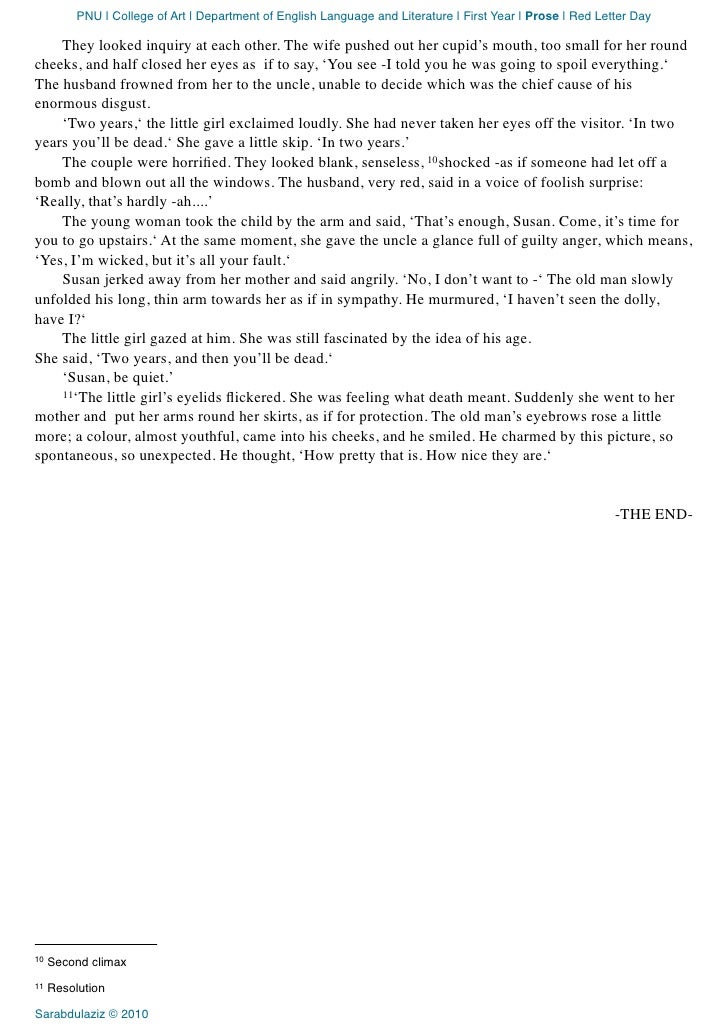She was a short, stout woman with a red. From the beginning of the story,the writer. Now we'll apply that on the characters of "Red Letter Day": Why the couple are flat characters? At the beginning of the story, the wife was trying to convince her husband that they cannot have the old man that day as a guest.